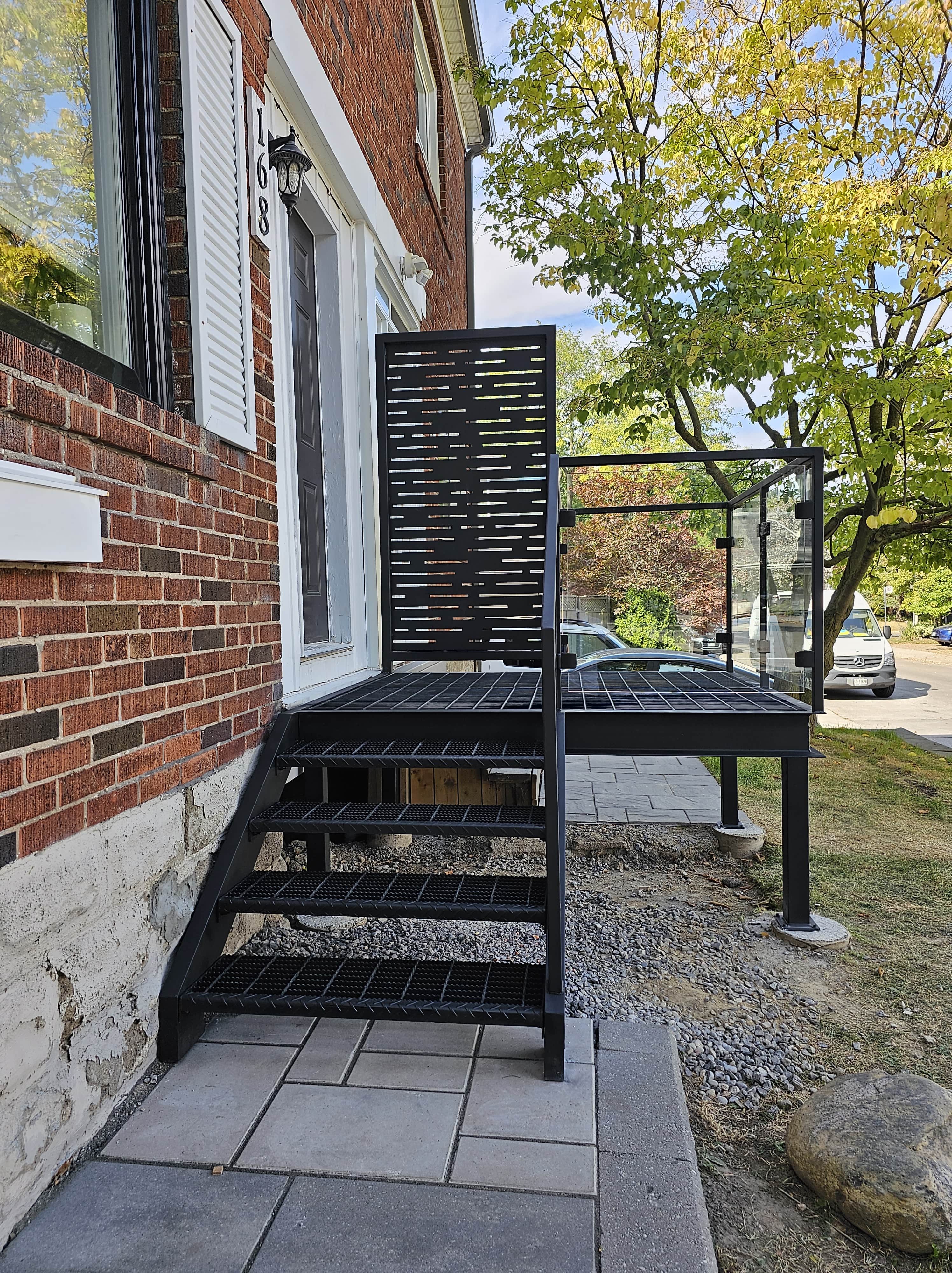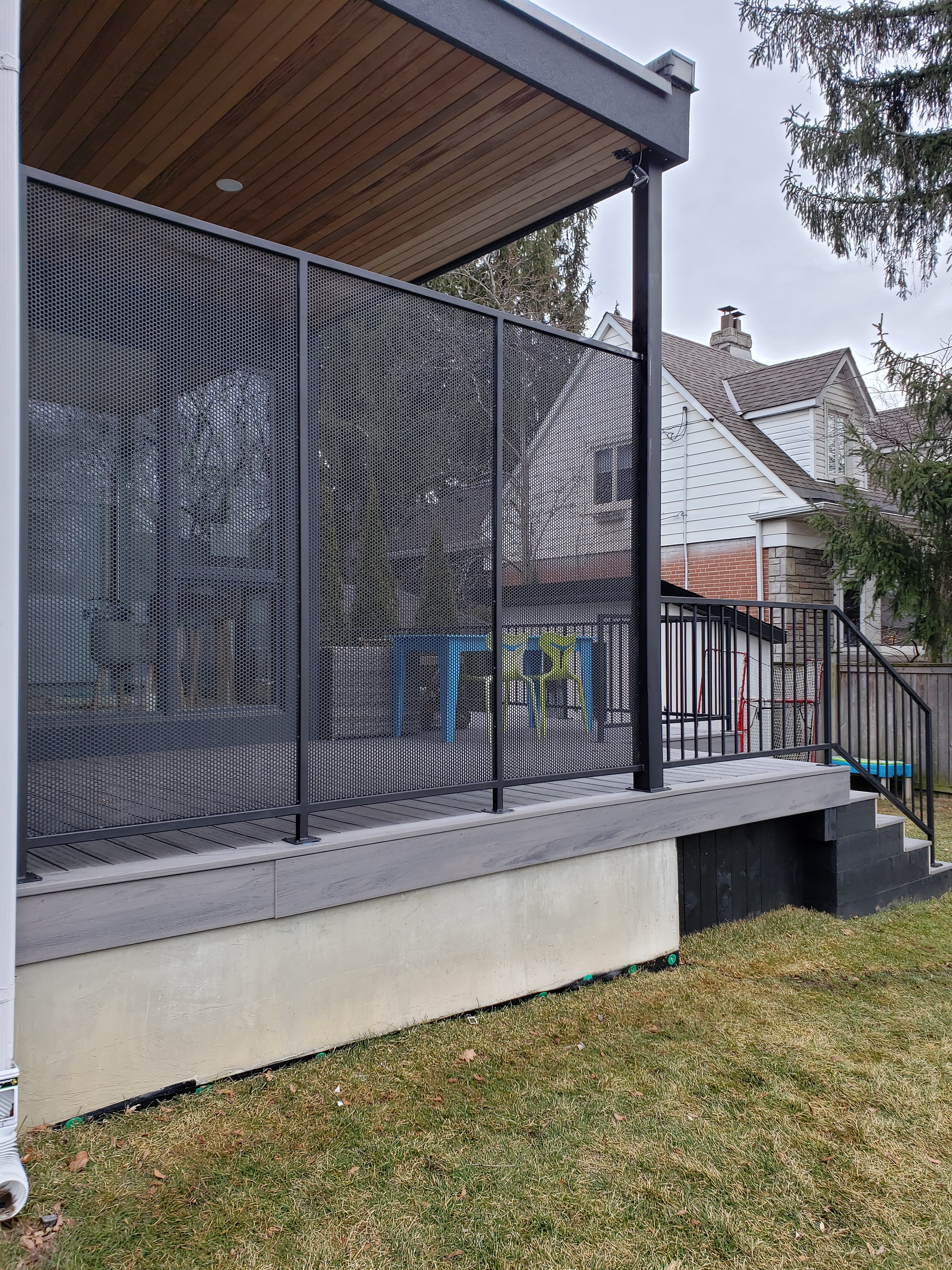 – Privacy screens partially hide everything that happens in your yard. They can be solid or with small holes (semi-privacy), allowing you to look outside from the deck but not from the street into the home.